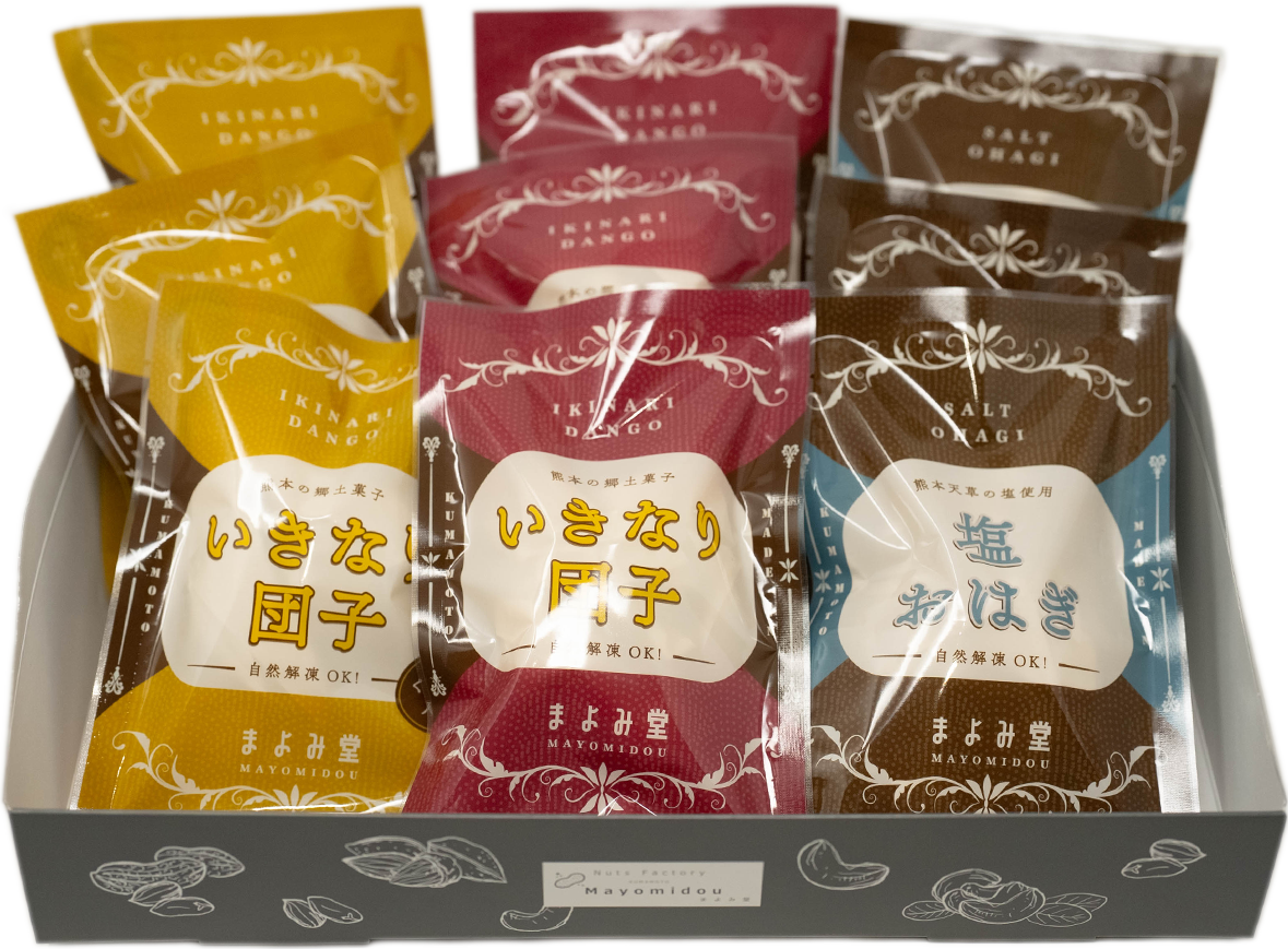 - いきなり団子2個入り3袋・いきなり団子くるみ入り2個入3袋・塩おはぎ2個入3袋で合計18個となっております。