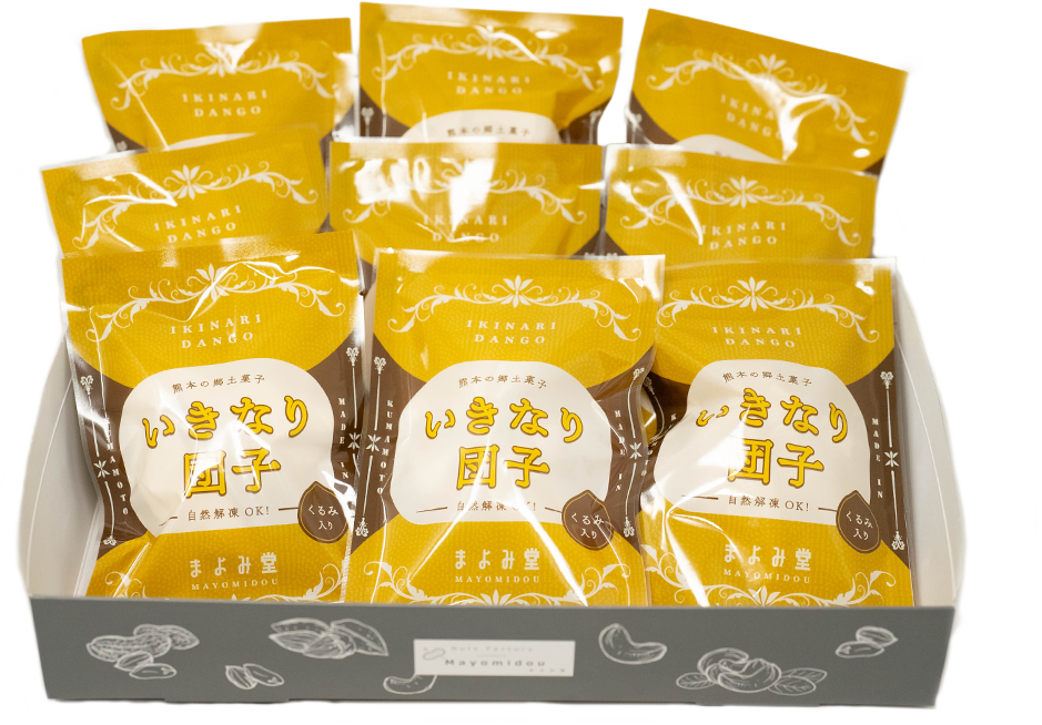 この「いきなり団子くるみ入り18個セット」で、まよみ堂のオリジナル和菓子をお楽しみください!おやつやお土産にもぴったりです。